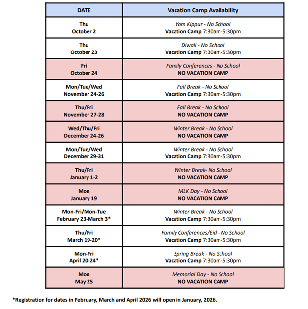 Daily Schedule: Vacation camps are full of exciting enrichment opportunities, outdoor play, field trips, and more! A detailed newsletter and daily schedule will be sent to families at least 3 weeks prior to the start of camp, which will include all relevant contact information, location, field trips etc.